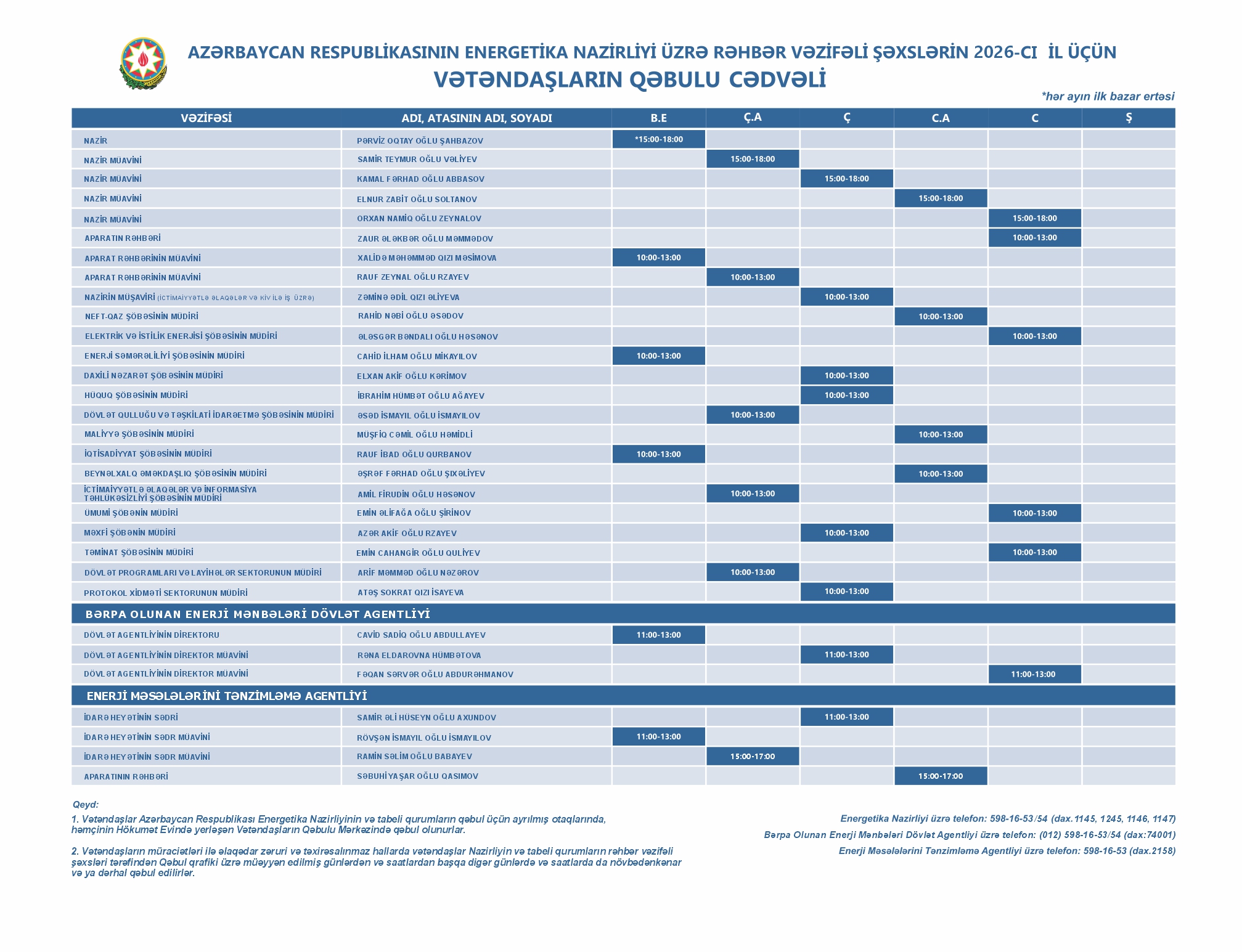ANA SƏHİFƏ Qəbul günləri cədvəl Vətəndaşların qəbulu cədvəli Vətəndaşların qəbulu cədvəli 14-04-2026 Energetika Nazirliyində vətəndaşların qəbulu qaydası facebook twitter Çap et e-mail